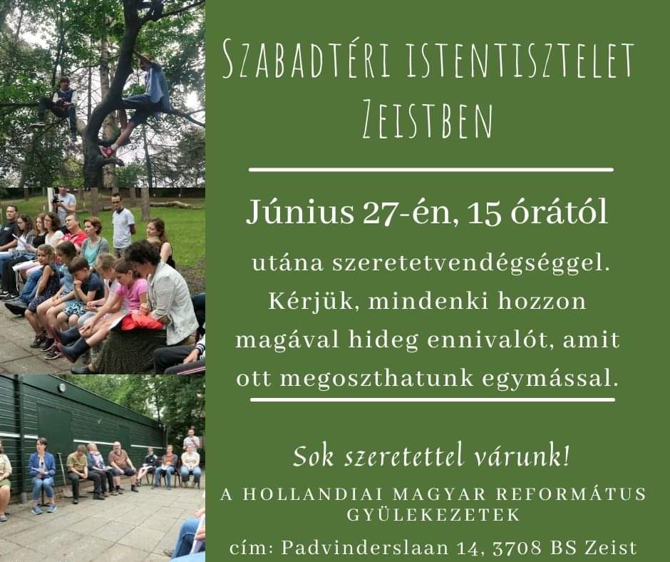 Idén június 27-én, 15 órától ismét sor kerül a magyar református gyülekezetek éves találkozójára. Előbb szabadtéri istentiszteletre kerül sor, majd szeretetvendégség következik. Mindenki hozzon magával hideg ennivalót, amit egymással meg lehet osztani. Az esemény helyszíne, a tavalyi alkalomhoz hasonlóan a cserkészeti központ lesz, melynek címe: 3708 BS Zeist, Padvinderslaan 14