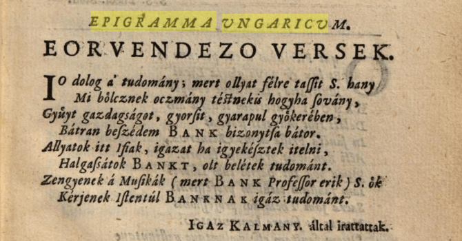 Összeállításunkhoz Kolozsvári Igaz Kálmán akadémiai üdvözlő versét csatoljuk a tudománnyal való beoltás hasznáról. Franekérában írta 1647. március 15-én Laurentius Bank tiszteletére, annak professzorrá való választásának alkalmával. (Lelőhelye: Applausus academici honori et famae … Laurentii Banck. Franekéra, 1647)