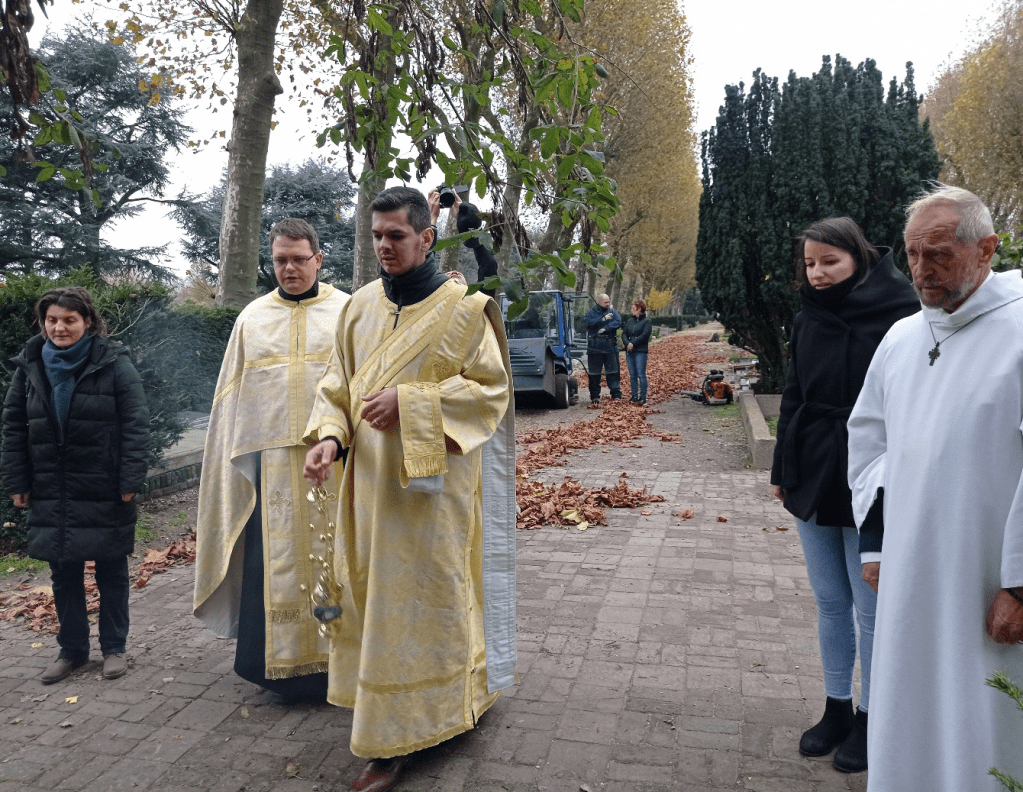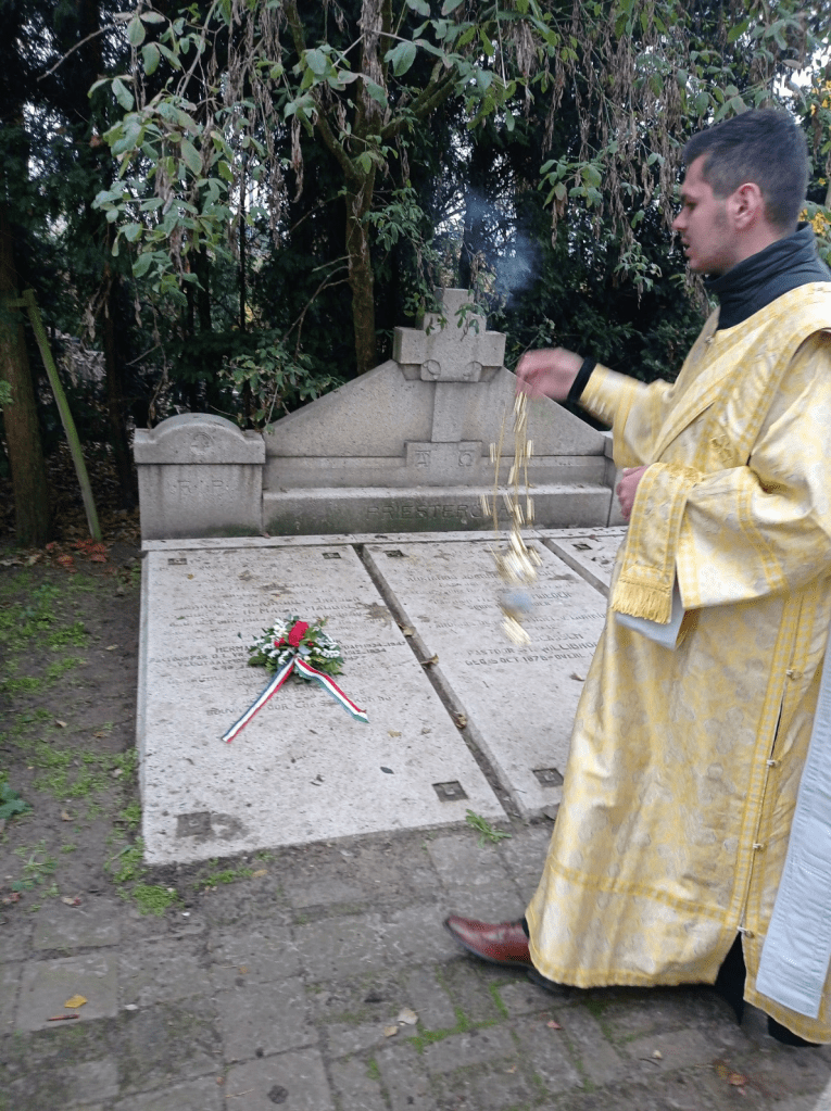 A magunk részéről mi egy olyan, magyar színekkel díszített koszorút vittünk a sírra, amelyet a Tóth Istvánt gyászolók adtak nekem. Megkértek, hogy a koszorú legyen ott a Mária ikonnal együtt, amikor Fülöp Metropolita megérkezik és Wassenaarban ünnepeljük a Szent Liturgiát. Meghagyták, hogy ezután a koszorút el lehet vinni a Knébel Miklós síremlékére Amszterdamba.