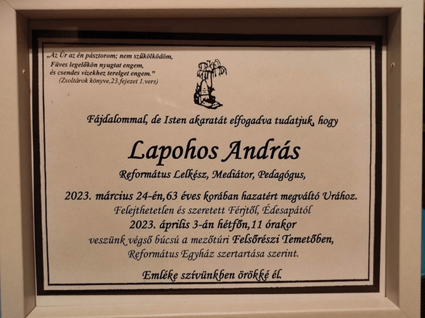 Szívem égő fájdalmával tudatom, hogy a legdrágább férj, jó barát, hűséges társ, nélkülözhetetlen, pótolhatatlan drága édesapa, hosszú, hősies küzdelem után megtért Teremtőjéhez… Emléke örökké szívünkben él és táplálja lelkünket!