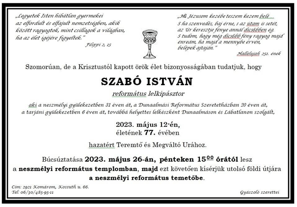Édesapánkat magához szólította az Úr Jézus május 12-én. Mindig nyitva volt a szíve Isten felé. Olyan apa volt, aki Mennyei Atyánkra irányította a tekintetünket. Hálásak vagyunk Istennek, hogy hitben és szeretetben neveltek fel bennünket édesanyánkkal együtt, és megtanították nekünk, mit jelent Istent szolgálva élni.