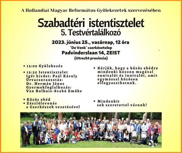 Immár hagyományosnak tekinthető a hollandiai református gyülekezetek testvértalálkozója – közös szabadtéri istentisztelete -, melyre idén is a zeisti cserkésztelepen kerül sor.